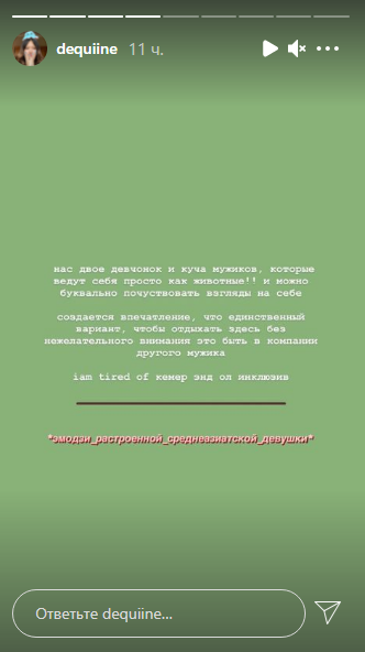 Казахстанская певица Dequine в сториз в Instagram пожаловалась на трудности отдыха в Турции, передаёт медиа-портал Сaravan.kz.