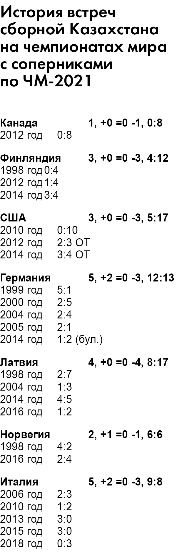 Сборная Казахстана свой первый матч на чемпионате мира проведет сегодня с хозяевами льда – хоккеистами сборной Латвии. С ними наша команда встречалась четырежды, но всякий раз терпела поражение. Самой болезненной оказалась неудача в Швейцарии в 1998 году – 2:7. Три других матча носили более напряженный характер. В каждом из них сборная Казахстана вела в счете, но не могла удержать победный результат. Впрочем, из всех 7 своих соперников по группе ЧМ-2021 наша команда не имеет отрицательного баланса только с норвежцами – по одной победе.