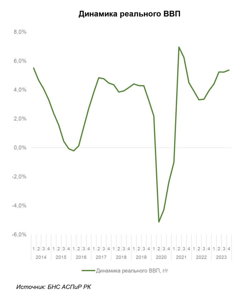 «Как видно из соответствующего графика, за последнее десятилетие трижды происходило падение динамики реального ВВП Казахстана. Наиболее глубокий спад пришелся на 2020 год, когда из-за пандемии коронавируса и жестких ограничительных мер динамика реального ВВП перешла в отрицательную зону», — говорит Тулеген Аскаров.
