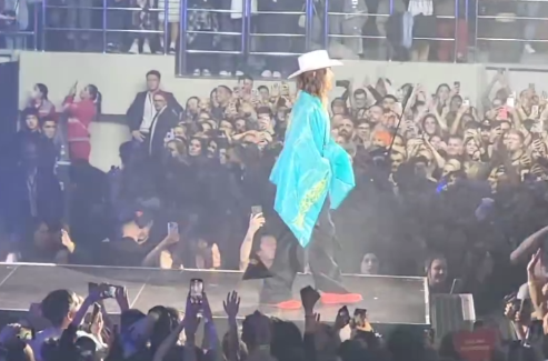 В таком виде артист попозировал для фото с фанатами, которых пустили на сцену.