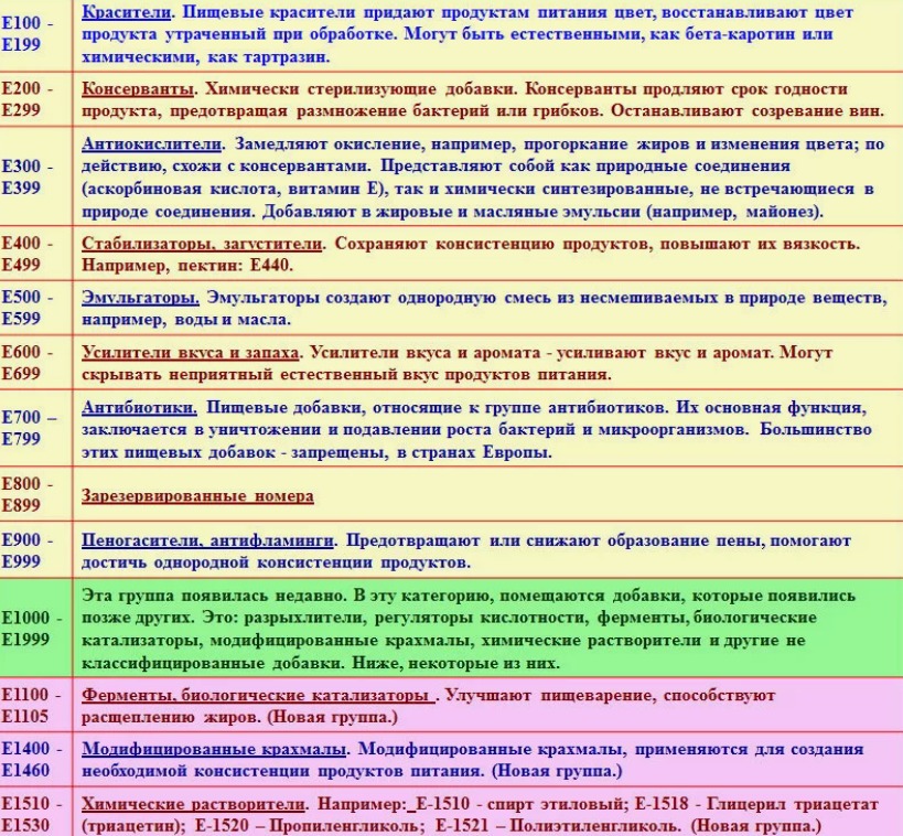 Это тоже неверно. Цифровой код присваивается по принципу предназначения добавки. Так, в градации с Е100 по Е199 находятся пищевые красители, Е200-Е299 — консерванты, Е300-Е399 -антиоксиданты, Е400-Е499 — стабилизаторы, Е500-Е599 — эмульгаторы, Е600-Е699 -усилители вкуса и аромата. Поэтому Е103 — это крайне токсичный краситель, запрещенный в большинстве стран мира, а зловеще выглядящий Е450 — безобидный набор микроэлементов, не опаснее щепотки мела.
