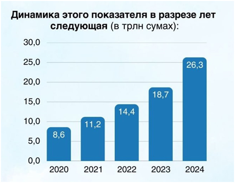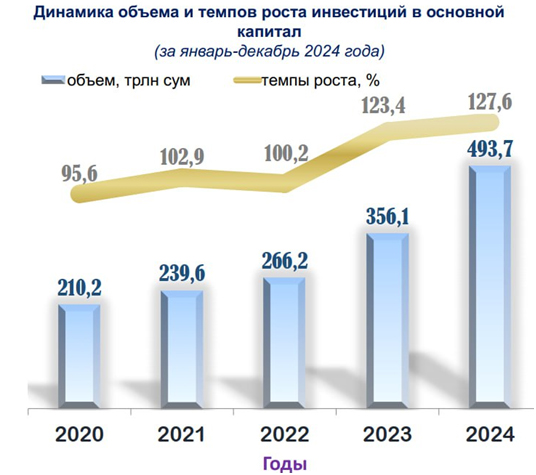 Вот пример, каких успехов Ташкент добился в привлечении инвестиций в экономику. По итогу 2024 года инвестиции в основной капитал составили 494 трлн сумов. Это 19,7 трлн тенге.