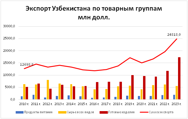 Сырья узбеки стали продавать меньше – в 2010 году было 6,3 млрд, в 2023 уже 5,6 млрд долларов.
