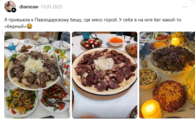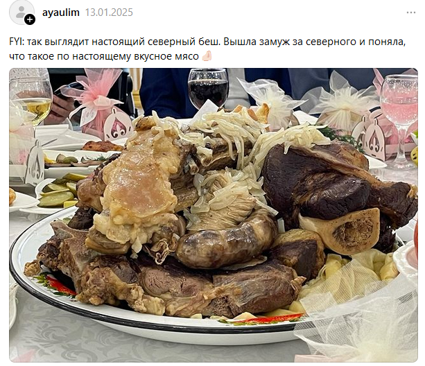 «Всю жизнь в Актау ел традиционный бешбармак: тесто, баранина, картошка, иногда даже тыква. То ли дело на севере, где в бешбармаке просто какой-то калейдоскоп мясных изделий: говядина, конина; мясо отварное, копченое, сүрленген (солено-вяленое сушеное – прим. ред. Caravan.kz); қазы, қарта, жая, жал. О последних трёх я вообще раньше только в учебниках по казахской литературе читал. Живут же северяне», — написал он.