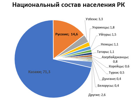 Всего БНС видит людей более чем 70 национальностей, проживающих в стране. Крупнейшие этносы, понятно, это казахи (14,5 млн человек, или больше 71 %), русские (3 млн человек, или 14,6 %).