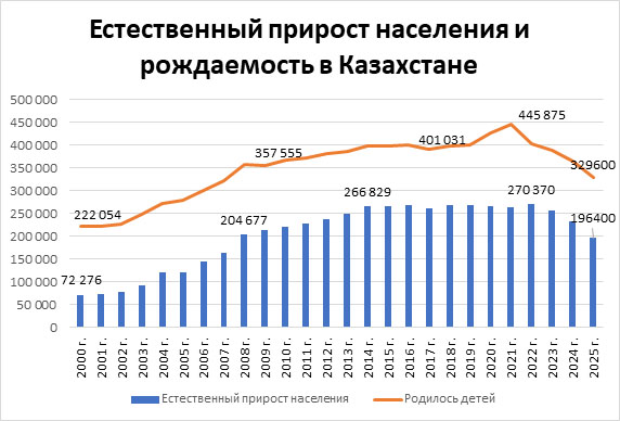 В 2025 году в Казахстане родилось 329,6 тыс. человек. Умерло по разным причинам — 133,2 тыс. человек. Естественный прирост населения составил 196,4 тыс. человек.