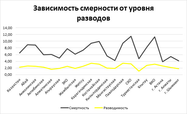 В регионах с наибольшим уровнем разводов отмечается наибольший уровень смертности. И наоборот. Так, самые крепкие семьи живут на юге и на западе страны – в Туркестанской, Жамбылской, Алматинской, Кызылординской, Мангыстауской, Атырауской областях, а также в Алматы и Шымкенте. Здесь же, как правило, зафиксирована минимальная смертность.