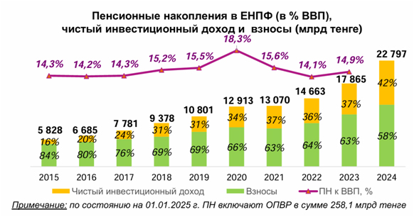 Это рост пенсионных накоплений за 10 лет. Видно, как активы фонда стабильно растут. Сегодня активы ЕНПФ уже выросли до 22,8 триллиона тенге. Причем 9,5 триллиона – это только инвестиционный доход, который нам с вами заработал фонд. Может, сказать ему спасибо за это? Руководство ЕНПФ на это нам и намекает.