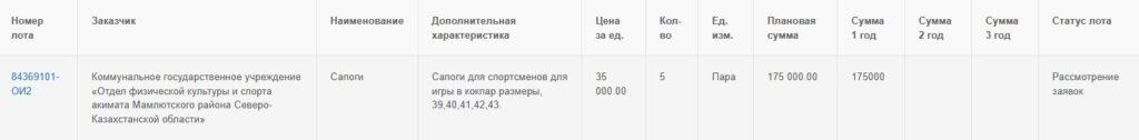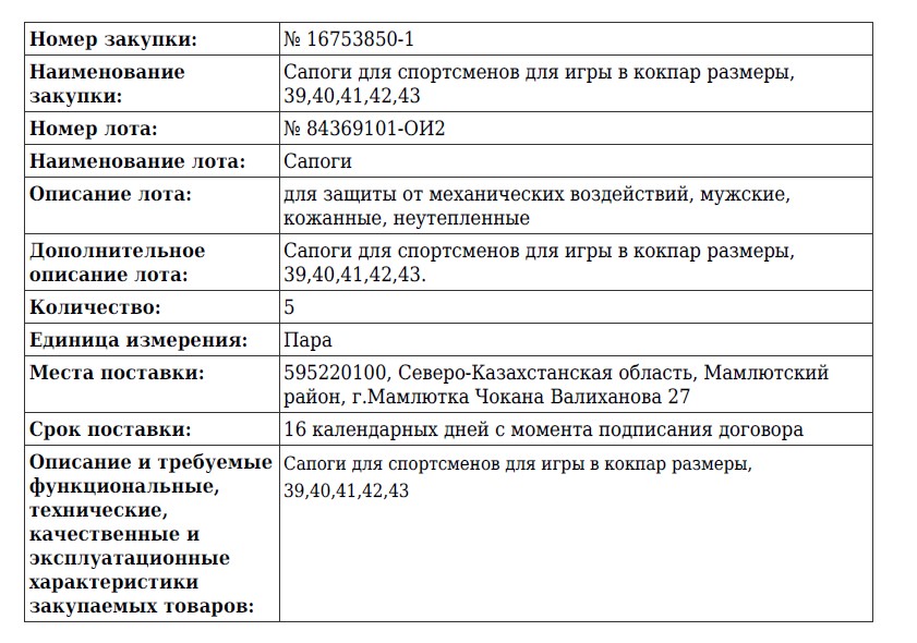 В Мамлютском районе готовится еще одна любопытная закупка. Отдел физической культуры и спорта местного акимата желает закупить 5 пар сапог для игроков в кокпар. Указаны размеры: 39, 40, 41, 42, 43. Всего на эту обувь выделено 175 тысяч тенге, 25 тысяч на каждую пару.