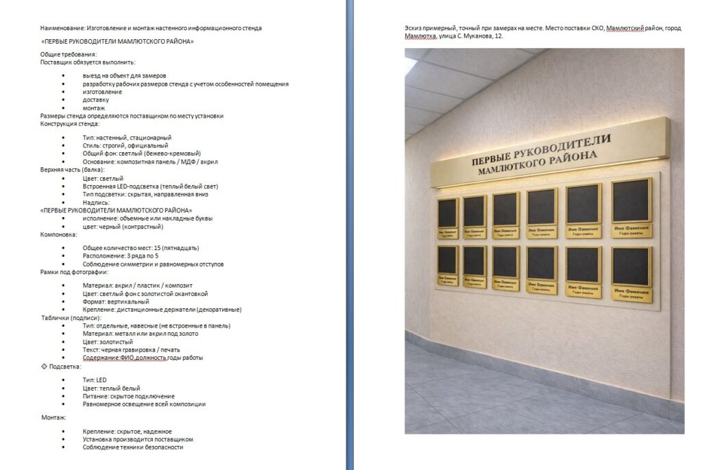 Согласно спецификации, стенд будет демонстрировать 15 портретов первых руководителей Мамлютского района. С ноября 2023 года районом руководит Елена Федоровна Степаненко.
