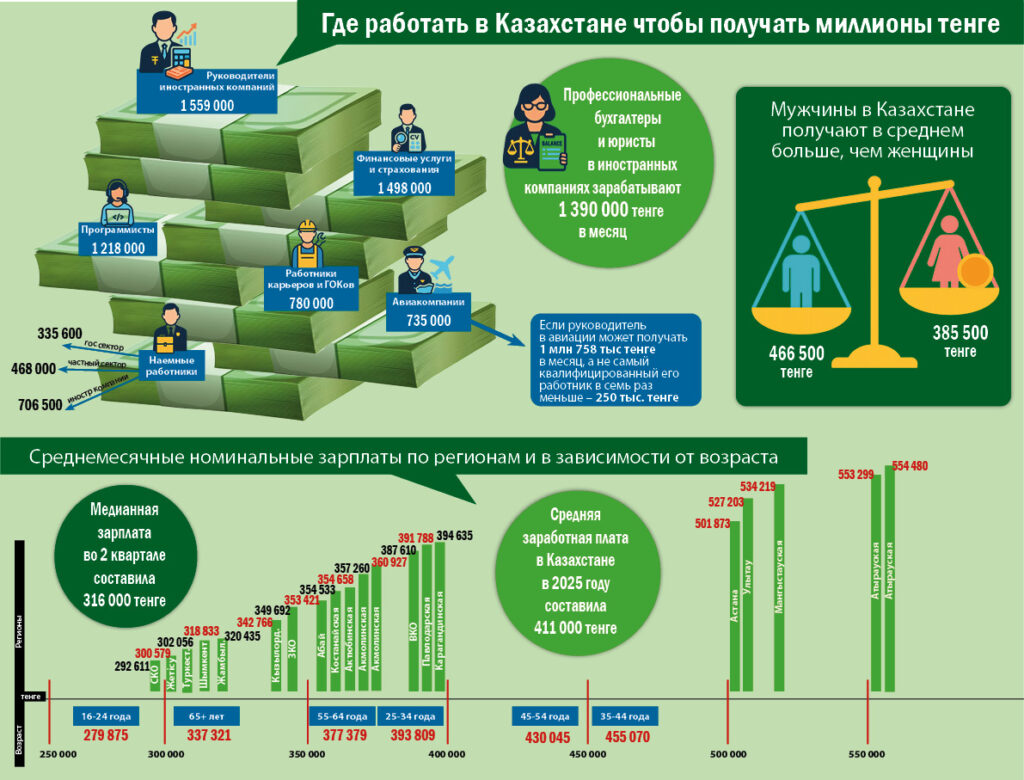 Эти данные БНС показывают только среднюю зарплату в стране. Более справедливый показатель – медианная зарплата. Во втором квартале она составила 316 тысяч тенге.