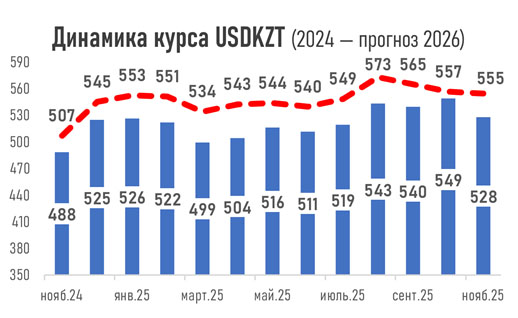 Но давление на тенге сохранится, и в следующие 12 месяцев курс прогнозируется на отметке 554,6 тенге за доллар. В основном из-за продолжающегося падения доходов от экспорта сырья, роста импорта (реализация инвестиционных и инфраструктурных проектов), планируемого резкого сокращения трансфертов из Нацфонда в следующем году (до 2,8 трлн тенге против 5,3 трлн тенге в 2025-м).