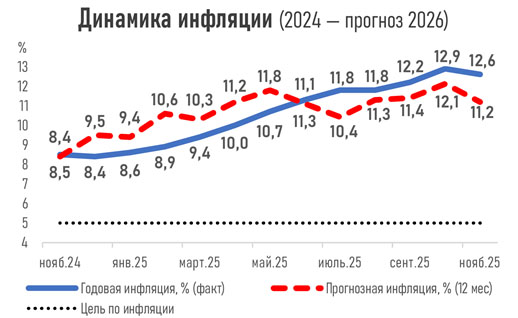 У правительства и Нацбанка есть свой целевой уровень инфляции (ИПЦ) – 5 % в год. Для возвращения этого показателя к целевому значению базовая ставка будет сокращаться очень медленно. Как ожидают эксперты, через год ставка будет снижена до уровня 15,75 %. Быстрое смягчение денежно-кредитных условий может усилить риски роста инфляции.