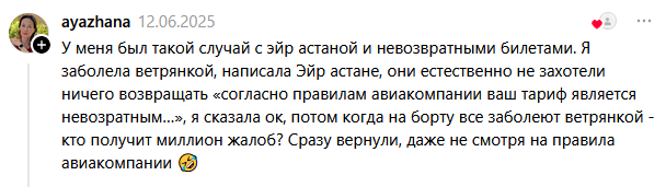 Air Astana, SCAT и Qazaq Air на запросы не ответили, однако FlyArystan прислал подробный полезный ответ. Так как авиационные правила для всех перевозчиков в Казахстане одинаковы, ответ FlyArystan может помочь и тем, кто бронировал билеты на рейсы других авиакомпаний.