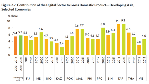 «…такие секторы, как транспорт на Фиджи, сельское хозяйство в Казахстане и туризм в Таиланде — все они развивались быстрее, чем… цифровая экономика. …что привело к снижению относительного вклада цифрового сектора в ВВП в каждой экономике. Между тем в период с 2008 по 2019 год доля занятости в цифровом секторе от общего числа занятых в регионе оставалась неизменной», — говорится в документе.