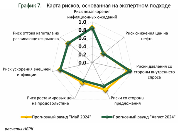 Остается высоким и риск оттока капитала с развивающихся рынков в пользу развитых. В случае сохранения или даже усиления устойчивого инфляционного давления в мире центральные банки развитых стран будут поддерживать жесткие денежно-кредитные условия более длительное время, что может негативно сказаться на валютах стран с развивающимся рынком. Кроме того, геополитическая нестабильность сохраняет повышенным санкционный риск в отношении страны-торгового партнера Казахстана. Что касается ВВП, то риски для его прогноза связаны с неопределённостью в отношении показателей добычи нефти и параметров будущей налогово-бюджетной политики.