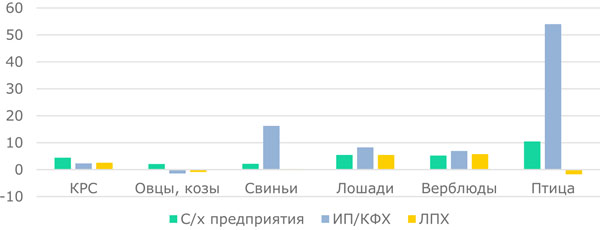 КФХ/ИС обеспечили более высокий рост поголовья лошадей (+8,3 % г/г), верблюдов (+6,9 % г/г), свиней (+16,2 % г/г) и птицы (+54,0 % г/г) по сравнению с сельхозпредприятиями.
