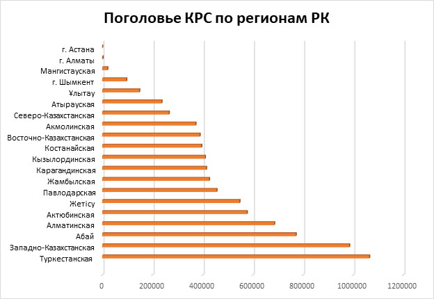 Крупнейшими скотоводческими регионами являются Туркестанская (свыше 1,1 млн голов КРС), Западно-Казахстанская (около 0,98 млн), Абайская и Алматинская области.