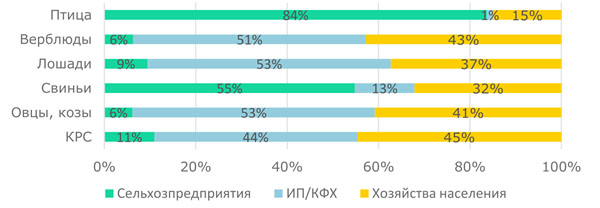 Доминирование сельхозформирований наблюдается по другим видам животных: 61 % численности овец, 63 % поголовья лошадей, 57,2 % верблюдов также принадлежат СХП и КФХ.
