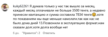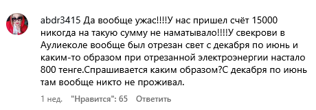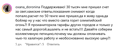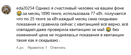Итог — вместо 400 кВт по 32 тенге мы получаем 100! И, здравствуйте, 23000 тенге за свет май!» — поделился он.