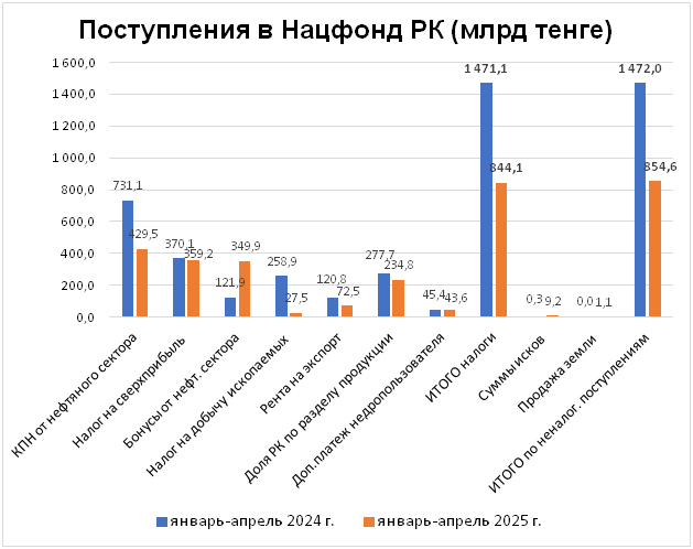 По данным НБ РК, за январь-апрель 2025 года всего в Нацфонд поступило 854,6 млрд тенге. Тогда как за такое же время прошлого года пришло 1 трлн 472 млрд тенге. То есть в этот раз на 41,9 % меньше.