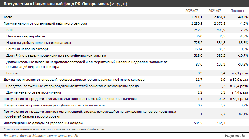 Как отмечают аналитики Finprom, главная причина провала – резкое сокращение поступлений. Доходы фонда упали на 40 %. Корпоративный налог с нефтянки снизился почти на 18 %, доля Казахстана по контрактам с нефтяными компаниями тоже уменьшилась: 518,6 млрд тенге против 580,5 млрд тенге годом ранее.