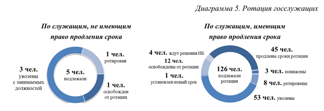 В целом госслужба отмечается стабильностью и низким уровнем сменяемости. В 2023 году доля чистой сменяемости составила 4,9 %, или 4 385 человек (в 2022 году – 4,7 %, в 2021 – 6,2 %, в 2020 – 5 %).