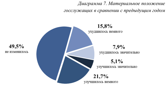 Половина опрошенных чиновников (49,5 %) считают, что их материальное положение по сравнению с предыдущим годом не изменилось, каждый четвертый считает (23,7 %), что ухудшилось.