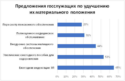 Для улучшения социального положения госслужащих наибольшее количество респондентов предлагает ежегодную индексацию заработной платы не ниже уровня инфляции (65 %), увеличение размера ежегодного пособия для оздоровления (53 %), внедрение эффективной системы жилищного обеспечения (44 %), полноценное медицинское обслуживание (31 %), пересмотр пенсионного обеспечения (28 %) и др.
