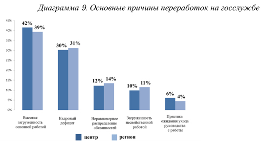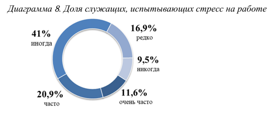 23,2 % служащих не удовлетворены отношениями с руководством. 28,4 % респондентов отмечают отсутствие баланса между работой и личной жизнью, 68 % задерживаются после работы либо доделывают работу дома. В целом основной причиной переработок является высокая загруженность основной работой. При этом порядка 30 % респондентов считают, что переработки также связаны с нерациональной организацией труда