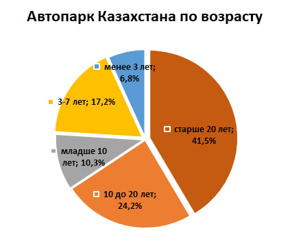Сегодня в автопарке Казахстана преобладают машины старшего поколения. 41,5 % всех легковых автомобилей старше 20 лет. Еще четверть (24,2 %) – в возрасте от 10 до 20 лет. Доля автомобилей от 7 до 10 лет составляет 10,3 %, а от 3 до 7 лет – 17,2 %. Машин, выпущенных менее трех лет назад, в стране 6,8 %.