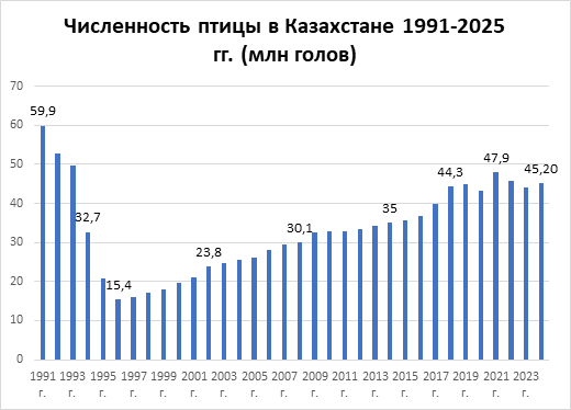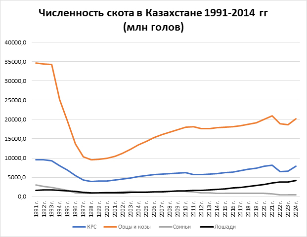 По данным госкомстата, в 1991 году численность КРС составляла 9,5 млн голов. Пик упадка пришелся на 1998 год: поголовье снизилось до 3,9 млн. Овец и коз в стране было больше 34 млн, стало 9,5 млн. С 60 млн птиц на 1991 год показатель упал до 15 млн.