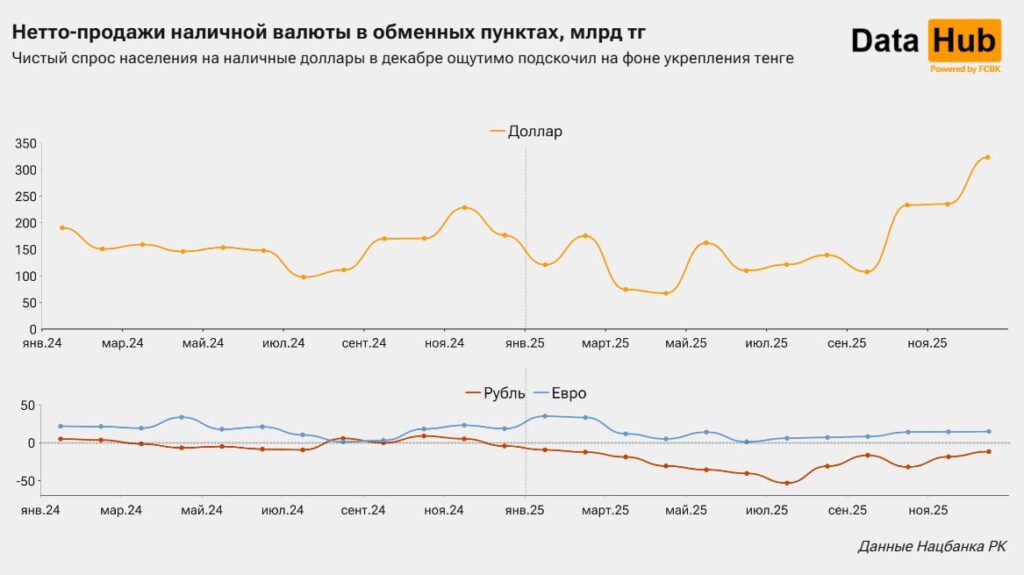 В конце 2025 года в обменниках Казахстана случилось то, чего рынок не видел уже четыре года. Согласно данным Первого кредитного бюро, чистые продажи наличных долларов – то есть разница между тем, сколько валюты обменники продали населению и сколько купили у него – в декабре достигли 322,8 млрд тенге. Это один из крупнейших скачков интереса к американской валюте за всю современную историю наблюдений, передает Caravan.kz.