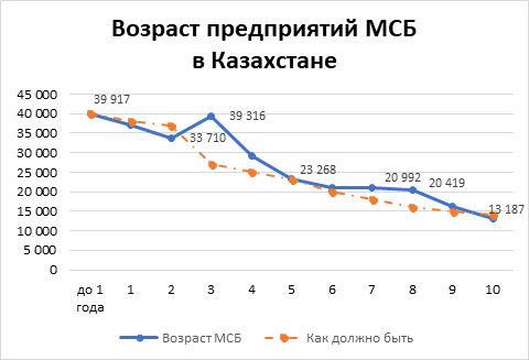 В экономике Казахстана конкуренция низкая, поэтому, скорее всего, такая компания будет расти вширь, отпочковывая от себя новые проекты. В итоге она может превратить во что-то вроде холдинга. Значит, число предприятий среднего уровня должно постепенно расти за счет появления новых компаний. Поэтому график «старости» для всех предприятий должен выглядеть как слегка наклоненное вправо плато.