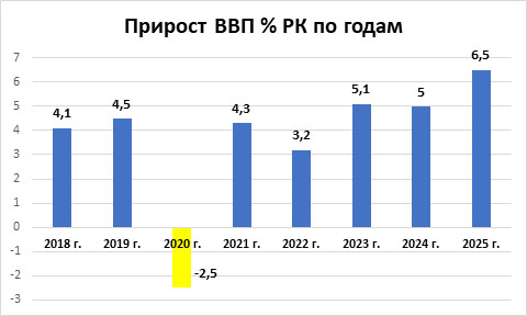 В итоге в 2020 году экономика Казахстана просела сразу на 2,5 %. Но после начала быстро восстанавливаться. Уже в 2021 году прирост был 4,3 %. В 2025 году ВВП вырос сразу на 6,5 %.