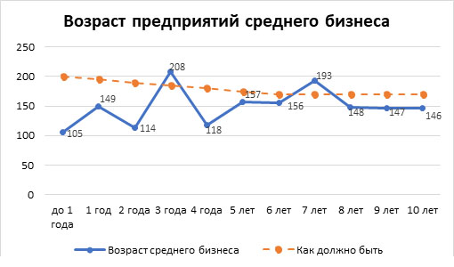 Да, конечно, дешевые деньги среднему бизнесу тоже важны. Поэтому два «горба» стоят ровно на тех же годах, что и на графике возраста для всего МСБ – 3 года и 7 лет. Но метания графика – колебания до 100 % — показывает такое же метание отношения государства к развитию бизнеса. И в целом число средних предприятий в стране особо не растет.