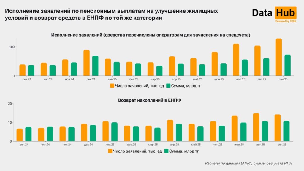 А вот категория «на жилье» продолжает держаться уверенно – без скандалов и расследований. В сентябре казахстанцы подали почти 129 тысяч заявлений на сумму 73 млрд тенге, что на 20 % больше, чем месяцем ранее.