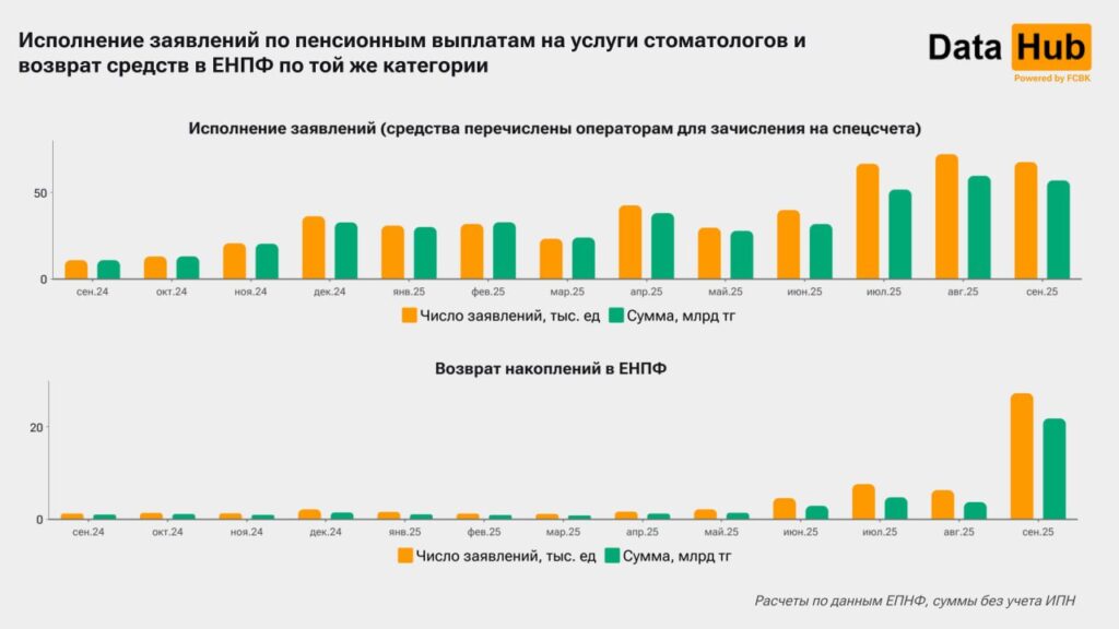 На фоне запрета стоматологии активность в этом направлении немного снизилась – всего на 4–6 %, но резко подскочили возвраты средств в ЕНПФ: почти 22 млрд тенге по более чем 27 тысячам заявлений. Для сравнения, месяцем ранее таких возвратов было всего 3,7 млрд. Это может говорить о массовом выявлении нарушений и фиктивных схем.