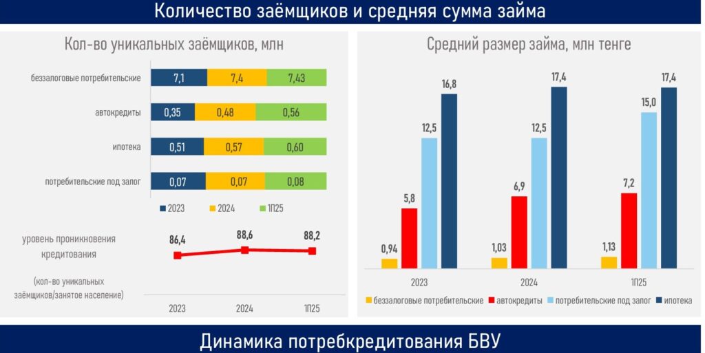 Это почти в два раза ниже увеличения числа занятых в экономике (+103 тысячи человек). Это привело к снижению уровня проникновения кредитования до 88,2 % с 88,6 % на начало года. Постепенно исчерпывается потенциальный спрос, так как население Казахстана растет медленнее, чем банки привлекают новых клиентов.
