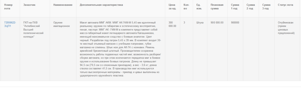 Например, Актюбинский высший политехнический колледж готов потратить почти миллион тенге – 900 тысяч – на три пластмассовых автомата Калашникова.