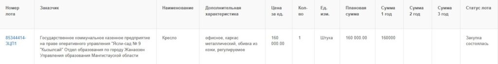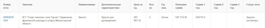 Дальше всех зашли сотрудники КГУ «Спорткомплекс села Таучик» управления физической культуры и спорта Мангистауской области. Учреждение приобрело два ортопедических кресла для руководителя, каждое стоимостью 267 857,15 тенге, в сумме вышло более полумиллиона тенге — 535 714,30.