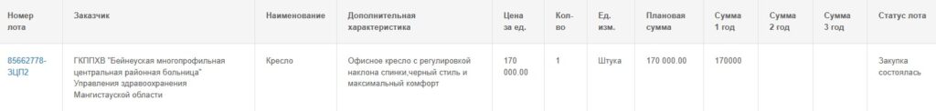 ГКППХВ «Бейнеуская многопрофильная центральная районная больница» управления здравоохранения Мангистауской области заказала «офисное кресло с регулировкой наклона спинки, черный стиль и максимальный комфорт» за 170 тысяч тенге.