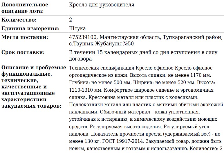 В целом, с тем, что сотрудникам нужно на чем-то сидеть, спорить никто не будет. Однако встает вопрос о стоимости кресел, особенно для руководителей. Большинство придерживается разумных рамок. Типичный пример – кресло за 70 тысяч тенге для областного центра крови при управлении здравоохранения Мангистауской области.