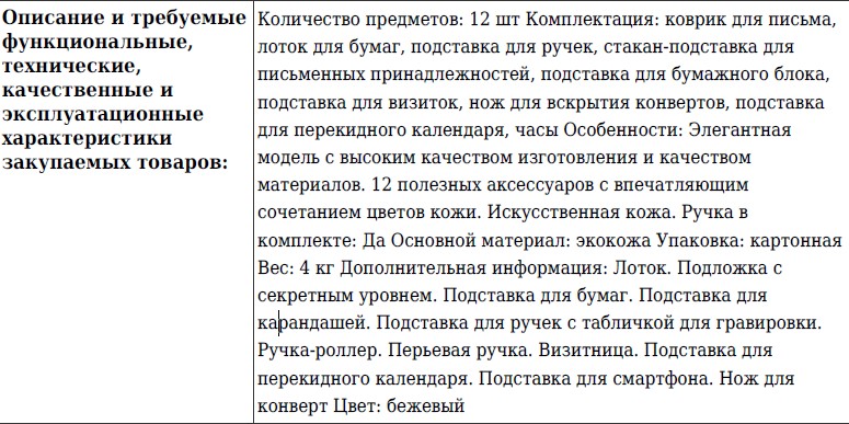 «Элегантная модель с высоким качеством изготовления и качеством материалов» включает в себя, например, подставку для перекидного календаря, которая кажется устаревшей в век цифровизации. Но это не точно. Потому что в спецификации можно увидеть сразу три противоречащих друг другу пункта. Документ сообщает, что в наборе должно быть 12 предметов, но в первом перечне элементов, в который входит и подставка под календарь, перечислено 10 предметов, если учитывать приписку про «ручку в комплекте», а во втором, где ручки перечислены отдельно, – 11.