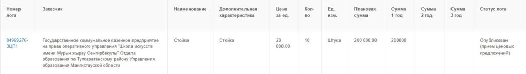 Однако школе искусств имени Мурын жырау Сенгирбекулы отдела образования по Тупкараганскому району понадобилось 10 таких стоек по 20 тысяч каждая, что приводит к общей сумме в 200 тысяч тенге.