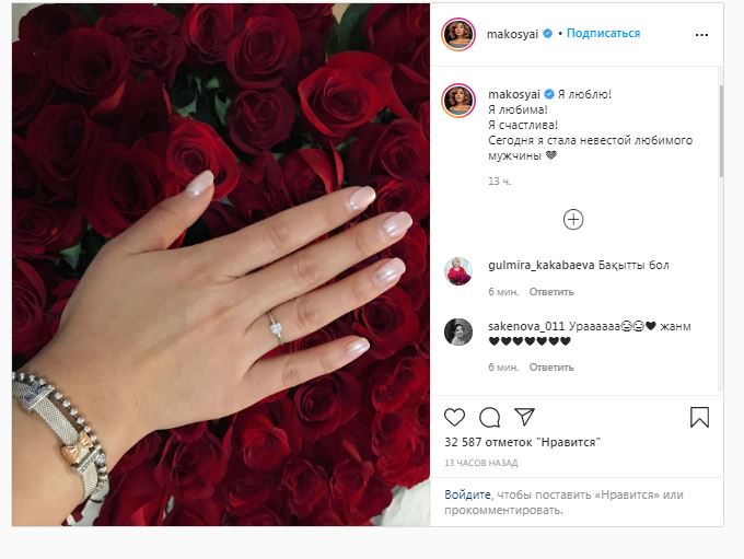 — Я люблю! Я любима! Я счастлива! Сегодня я стала невестой любимого мужчины, — написала она 14 февраля, пишет Caravan.kz.