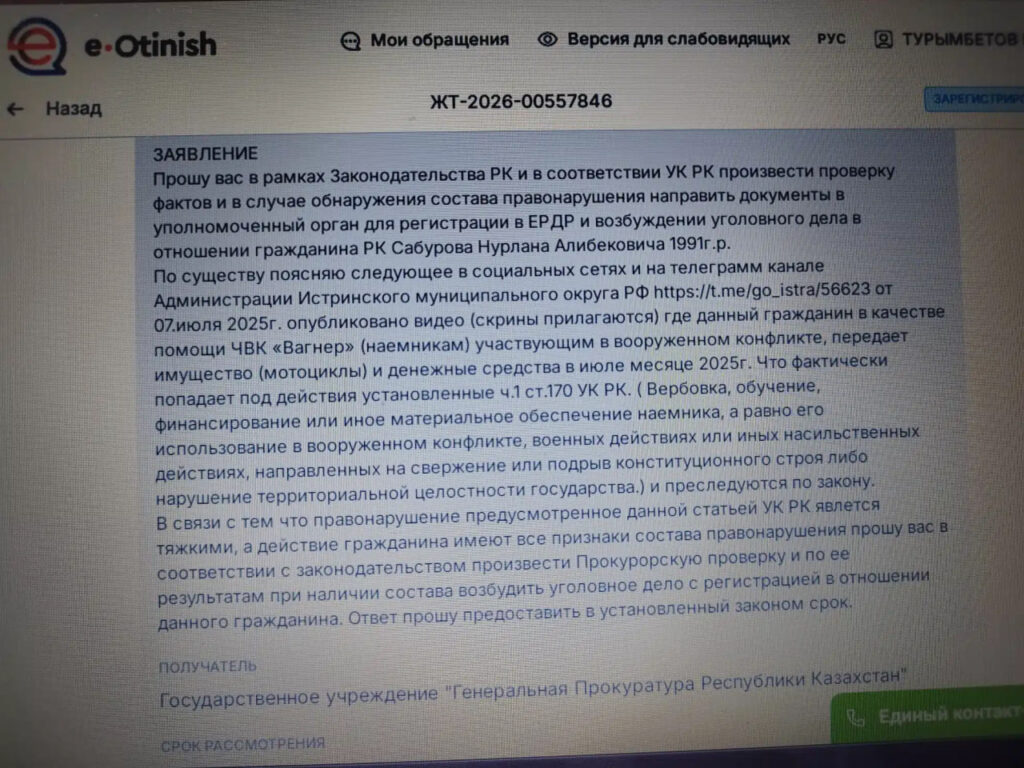 На фоне приезда Сабурова в Алматы в соцсетях всплыл ролик июля 2025 года, который стал настоящим информационным бумом. На нем он передает десять питбайков бойцам подразделения «Легион Вагнер Истра» и желает им «вернуться здоровыми и с победой». Многие сперва решили, а кто-то надеялся и продолжает надеяться, что ролик сгенерировали ИИ, но запись нашли в Telegram-канале Татьяны Витушевой – главы муниципального округа Истра.