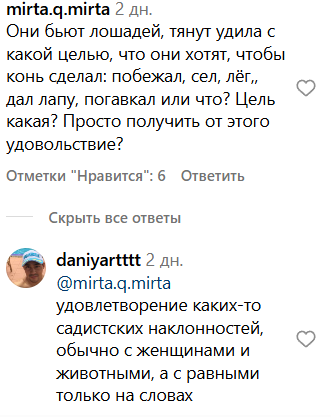 Пользователи Instagram из Казахстана выразили возмущение увиденным, комментируя жестокое обращение с животным. На распространенных в соцсетях кадрах заметно, как мужчины-кокпаристы бьют лошадей камчой и тянут их за узду, что вызвало волну критики, передает Caravan.kz со ссылкой на offside.kz.