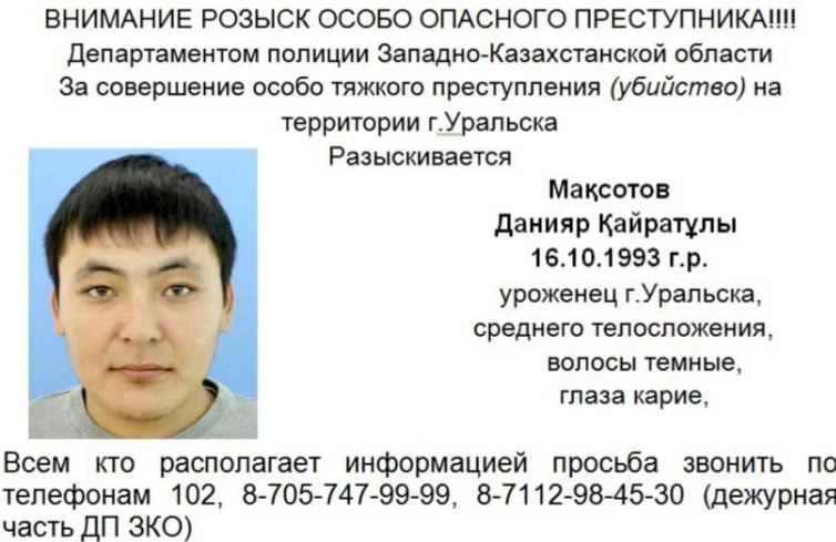 Ориентировку о том, что разыскивается особо опасный преступник, предоставили в пресс-службе департамента полиции ЗКО, передает «Мой Город«. В ней говорится, что ищут 31-летнего Данияра Максотова за особо тяжкое преступление — убийство. Подозреваемый среднего телосложения, у него тёмные волосы и карие глаза.