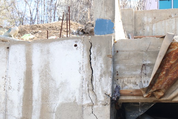 Невооруженным глазом видно, как в этом месте ползет вниз недостроенная конструкция из бетона, рискуя обрушиться вместе с тоннами грунта, частью улицы на нижние дома.
